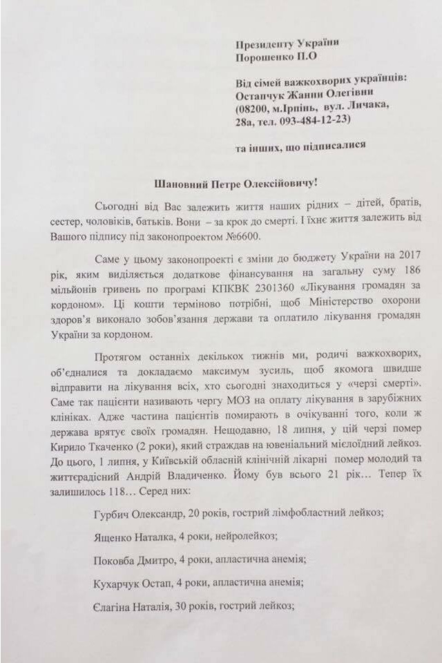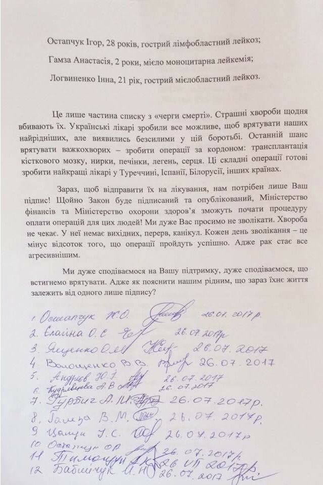 Зараз, щоб відправити їх на лікування, нам потрібен лише Ваш підпис! Щойно Закон буде підписаний та опублікований, Міністерство фінансів та Міністерство охорони здоров'я зможуть почати процедуру оплати операцій для цих людей! Ми дуже Вас просимо не зволікати. Хвороба не чекає. У неї немає вихідних, перерв, канікул. Кожен день зволікання - це мінус відсоток того, що операції пройдуть успішно. Адже рак стає все агресивнішим.