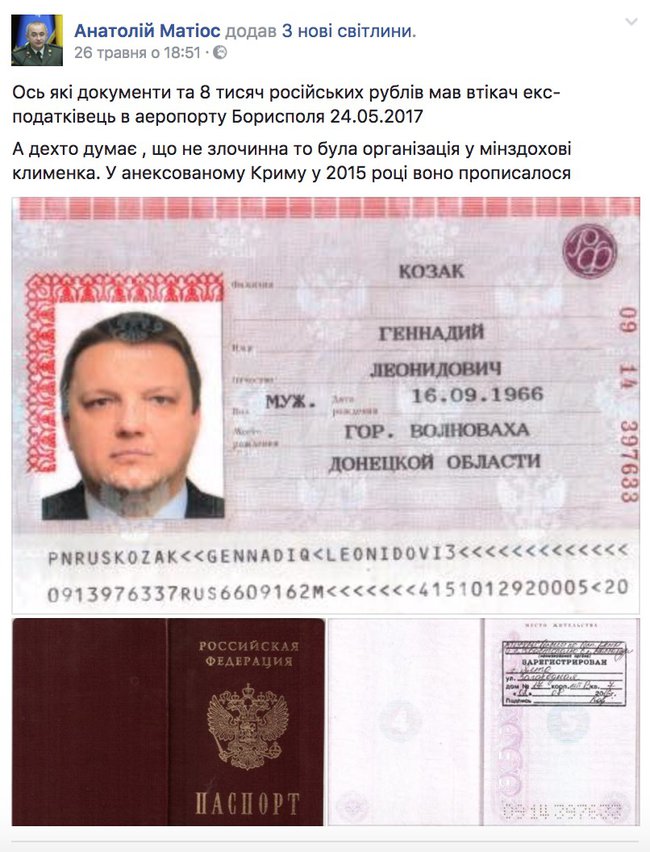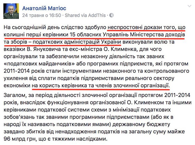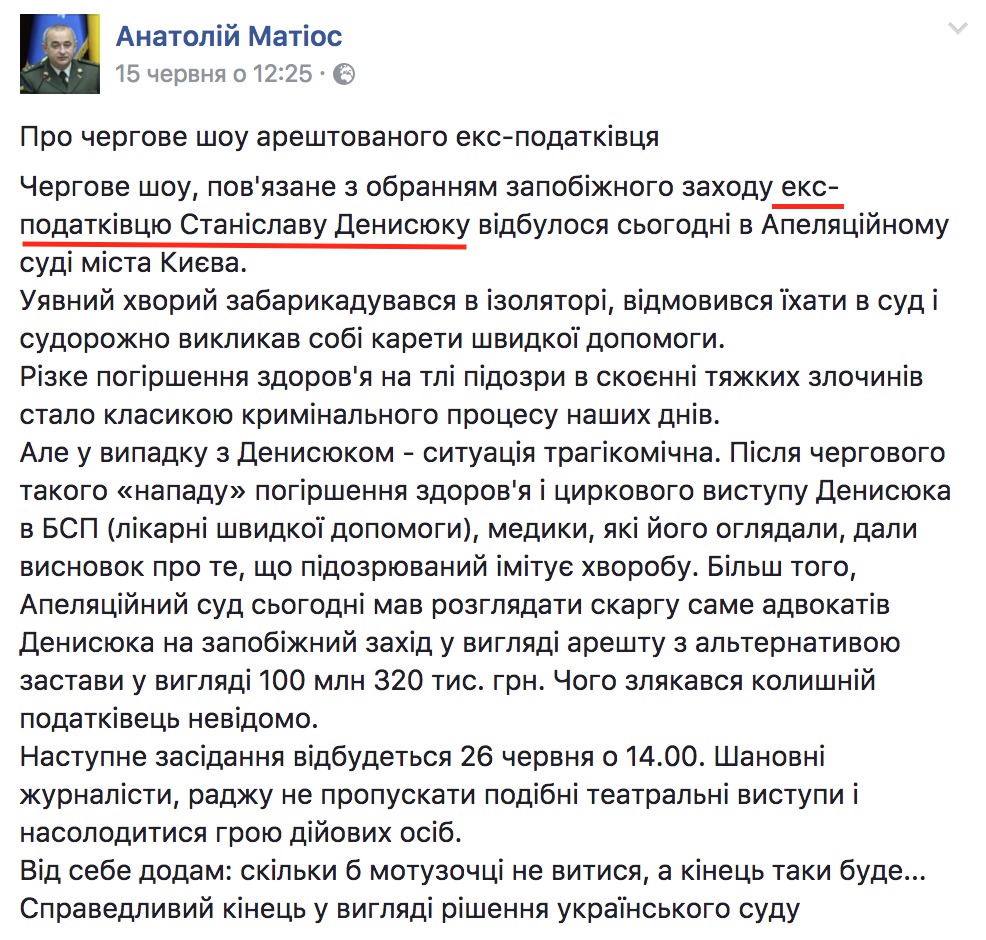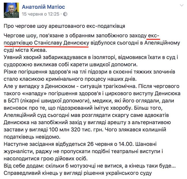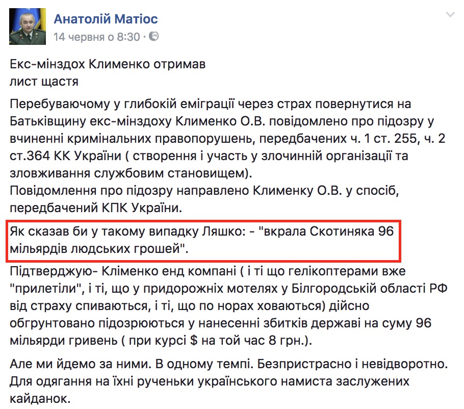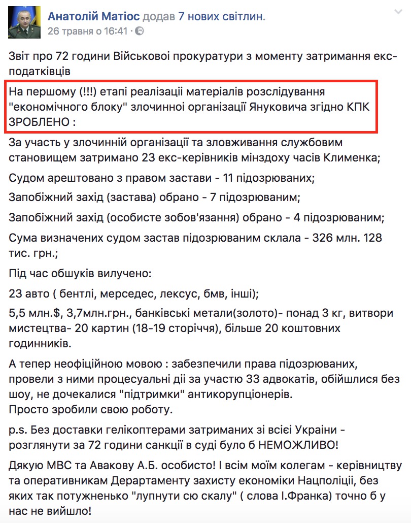 Намагається не відставати від шефа і головний військовий прокурор. У своєму профілі на Facebook він прямо вказує хто скільки "вкрав" з бюджету, оприлюднює прізвища затриманих осіб, та навіть публікує паспортні дані, – що також суперечить законодавству про захист персональних даних. До того ж останні гучні затримання з гелікоптерами побудили Анатолія Матіоса до ряду дописів, в яких з десяток людей отримали від нього ярлик "член злочинної організації".