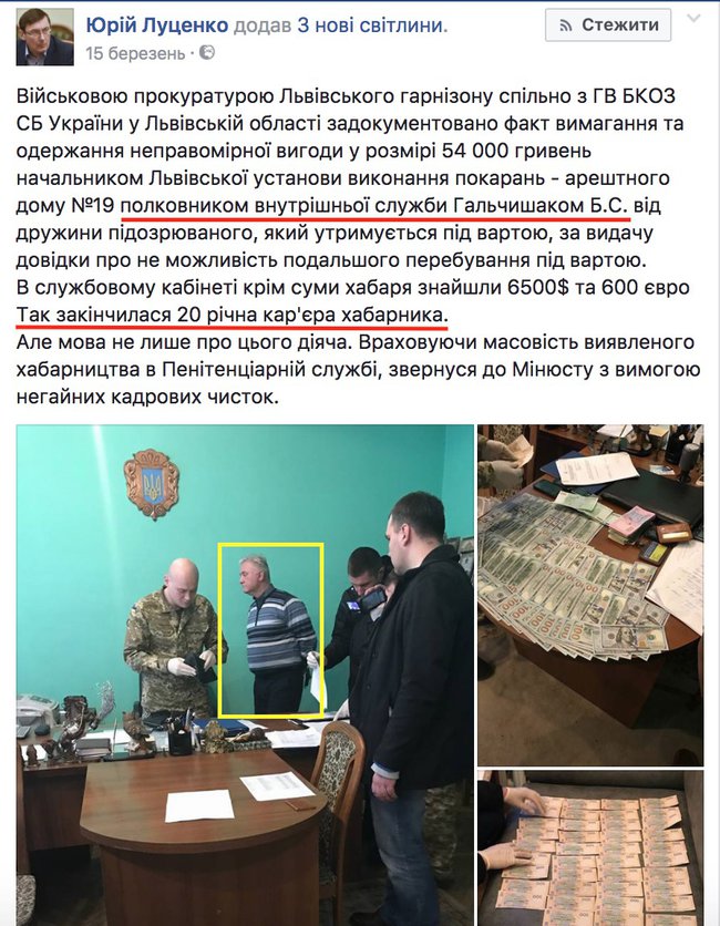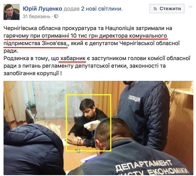 Також Генпрокурор дозволяє собі зазначати в тексті допису прізвище та конкретну посаду затриманого. При цьому додаючи характерне "хабарник" і вже традиційно – фото обличчя. Стається й так, що пости очільника прокуратури містять комбінацію: тут вам і фото обличчя, і прізвище з ініціалами, згадка конкретної посади, та ще й галаслива характеристика "закінчилась 20-річна кар’єра хабарника".