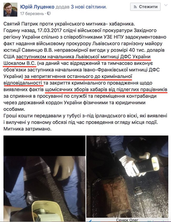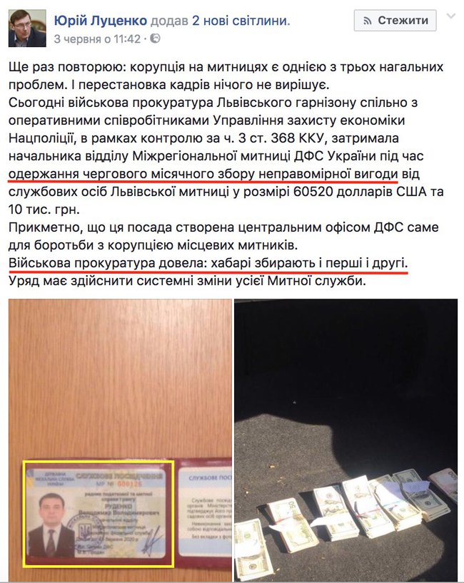 Інший пост доповнений фотографією посвідчення затриманого, де також легко розгледіти повне ім’я і навіть його обличчя. Генпрокурор характеризує останнього як систематичного "збирача хабарів".