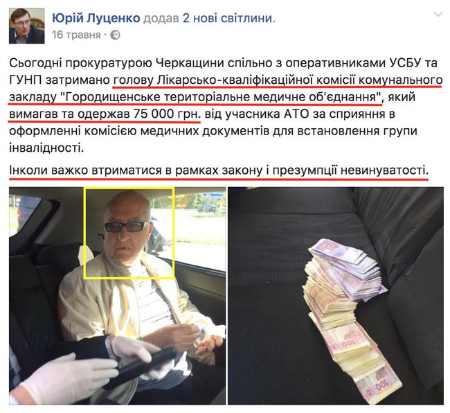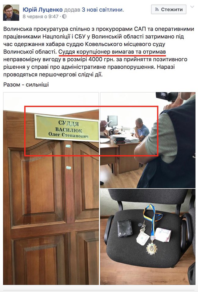 Лише за останні чотири місяці цього року Генпрокурор опублікував на власній facebook-сторінці п’ять дописів, які прямо заперечують презумпцію невинуватості. Для прикладу, в одному Юрій Луценко пише про затримання судді, називаючи його "суддею-корупціонером". Одночасно цей допис публікується з фотографією таблички, яка висить на дверях кабінету та де вказано повне ім’я затриманого.