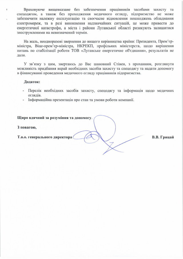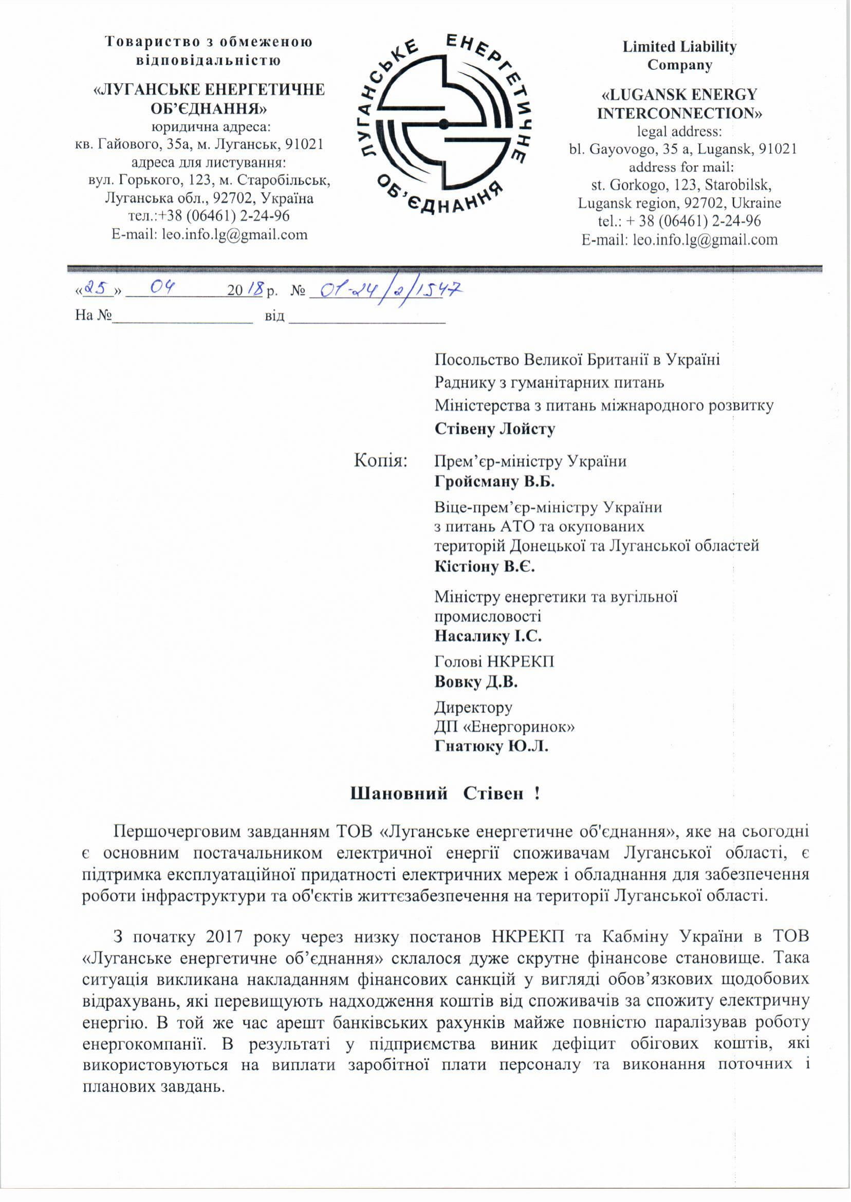 В зв’язку з вкрай важким становищем, колапсом в енергетичній системі, луганські енергетики звернулися за допомогою до Посольств Великої Британії та Норвегії в Україні, до Представництва ЮНІСЕФ (UNICEF) в Україні. В копію були додані Прем’єр-Міністр України Володимир Гройсман, міністри уряду, голова НКРЕКП Дмитро Вовк, директор ДП «Енергоринок» Юрій Гнатюк. Вони – знають про колапс електроенергетики воюючої Луганщини та про «знекровлення» Луганського енергетичного об’єднання, але, на жаль, півтора роки не можуть вирішити, що робити. Можливо, що іноземці допоможуть корисною порадою?