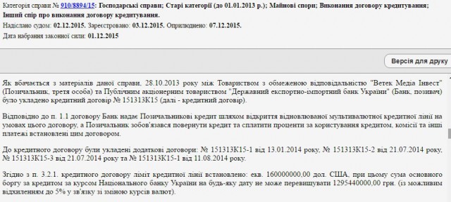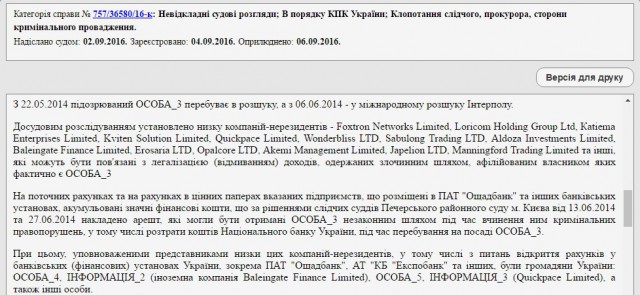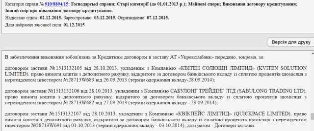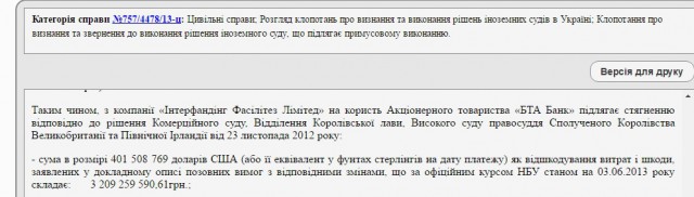 Отже, літом 2013 року сестра Портнова винесла ухвалу, згідно якої з компанії «Інтерфандінг Фасілітез Лімітед» на користь АТ «БТА Банк» підлягала примусовому стягненню чималенька сума в розмірі більше 400 млн. доларів США (або її еквівалент у фунтах стерлінгів на дату платежу).