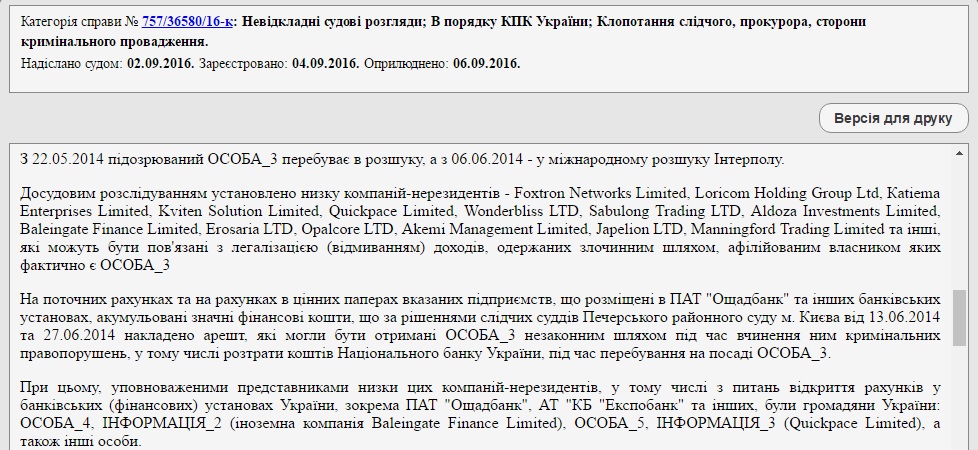 Адже, якщо говорити про ті мільярди, заради повернення яких в держбюджет ініційований закон про «спецконфіскацію», то мова передовсім йде про кошти, арештовані в державному «Ощадбанку» у справі Арбузова на рахунках цілого переліку офшорок. Їх назви можна знайти в Єдиному переліку судових рішень. Зокрема тут: