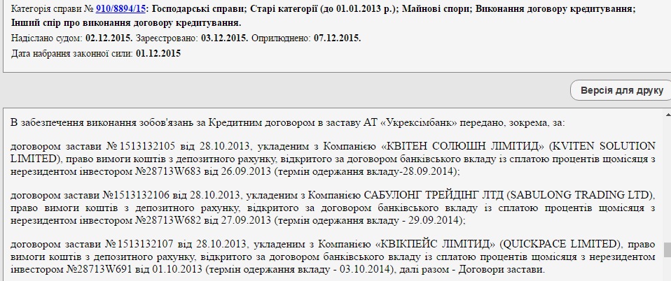 Інші три компанії Квітен, Сабулонг та Квікпейс з «переліку Арбузова» в державному «Укрексімбанку» в 2013 році були передані в заставу під кредит для компанії Курченка – «Ветек Медіа Інвест».