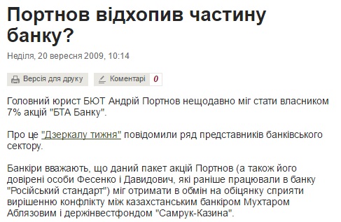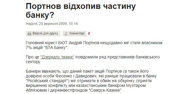 Все це я згадую, щоб продемонструвати, що Фесенко – іпостась Портнова, і те, що він очолив «БТА Банк», це справді означало, що туди зайшов Портнов. По суті, казахи дали в тимчасове користування Портнову цілий банк. Він не забарився цим скористатися.