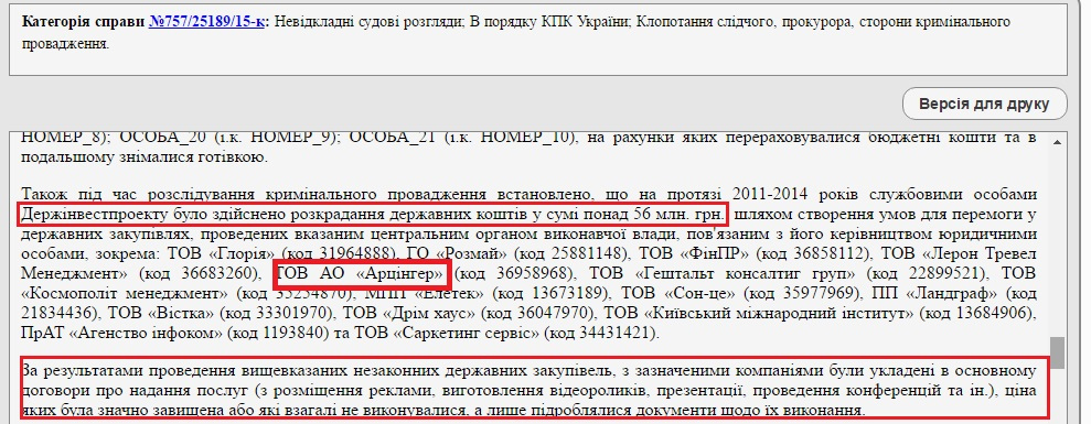 А ще в Єдиному реєстрі судових рішень є ухвала у справі Каськіва (Нацагенство), що свідчить – «Арцінгер» і там учасник злочину з розкрадання державних коштів.
