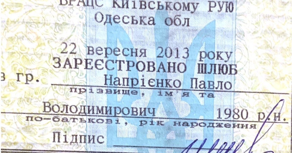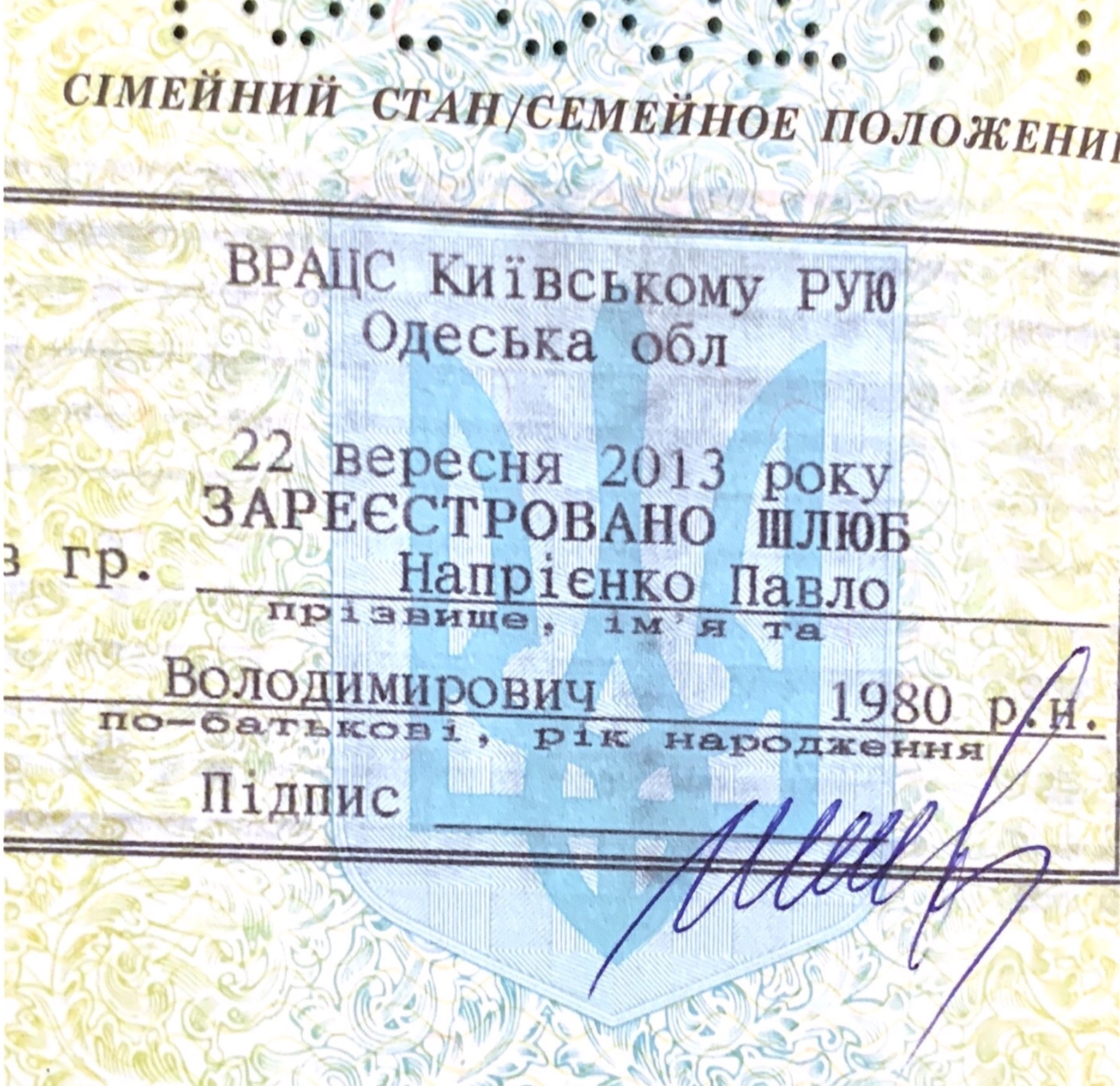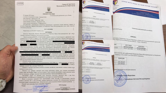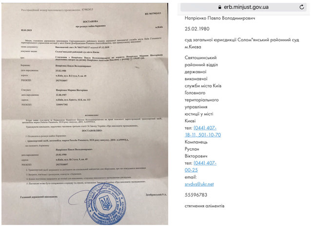 Штамп про шлюб із Павлом Напрієнком мною був сфотографований у Солом’янському районному суді міста Києва, 23 травня 2019 року. Там упродовж семи місяців, замість встановлених двох, тривав розгляд позову про стягнення аліментів. Три тисячі гривень на місяць на утримання своєї п’ятирічної доньки депутат і «олігарх» (про це далі) не платить. Через невиконання зобов‘язань щодо забезпечення малолітньої доньки, Державною виконавчою службою, навіть оголошено у розшук, а потім і арештовано його «Порш-Панамера».