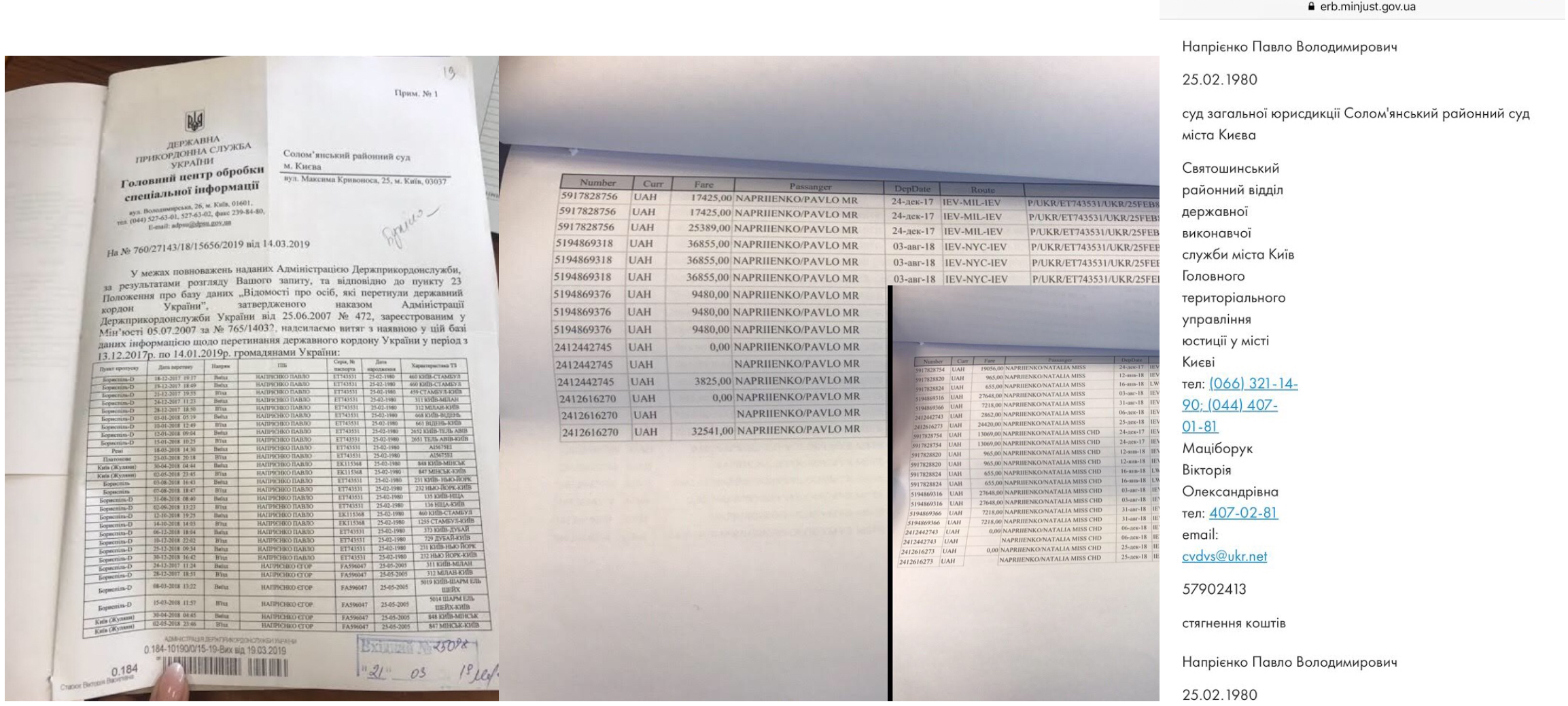 З цін на квитки ясно, що пара Напрієнко-Стародубцева літають або першим, або бізнес-класом. Характерні і авіакомпанії, які вони обирають — найдорожчі. Тому вельми дивно бачити виконавче провадження, де примусово стягують з батька 1/10 вартості одного його квитка першого класу на літак для утримання його ж дитини. Дішло до того, що депутата і «олігарха» Павла Напрієнка зняли з рейсу як злісного неплатника аліментів.