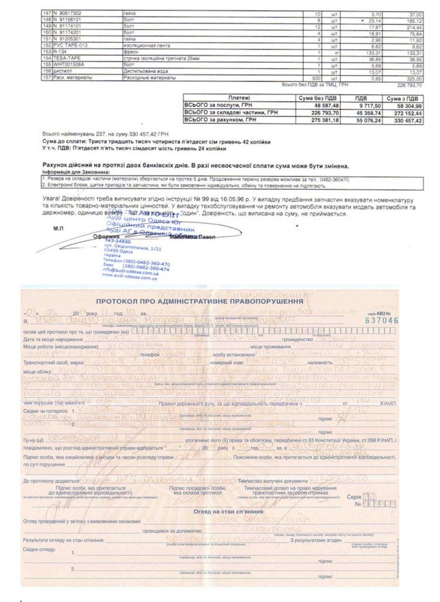 На додаток тут розміщено: документи по факту ДТП та переписка водія — дружини Павла Напрієнка, Марини, що потрапила у аварію. Із нею сперечається власник автосалону, через який продали розбиту А-7. Сам автосалон зареєстрований за цим підприємством. Цікаво, що ремонт А-7 становив половину її ринкової вартості — понад $41 000 по курсу $1 за ₴8.
