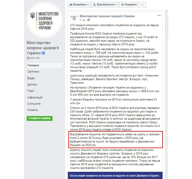 2. У пості МОЗ зазначає, що відправлення пацієнтів, які подаватимуть заяви на участь у програмі після 2 липня 2019 року, буде можливим з 2020 року. ТОБТО: якщо сьогодні до МОЗ надійдуть документи від хворого на лейкоз, який потребує трансплантації кісткового мозку через місяць, МОЗ скаже йому "чекайте до наступного року"!!!