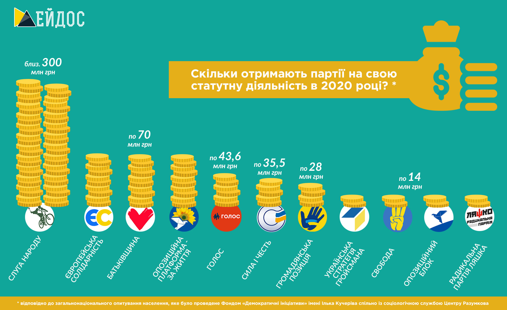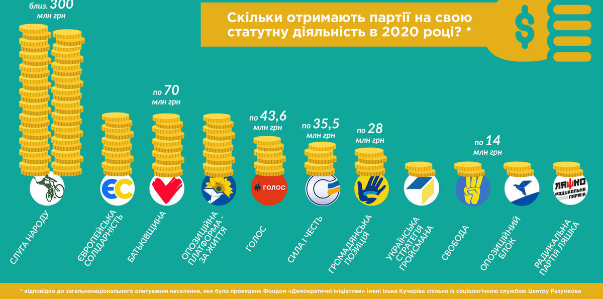 Якщо за основу взяти загальнонаціональне опитування населення, яке було проведене Фондом "Демократичні ініціативи" імені Ілька Кучеріва спільно із соціологічною службою Центру Разумкова, то партії на свою статутну діяльність лише в 2020 році отримають приблизно наступні суми: