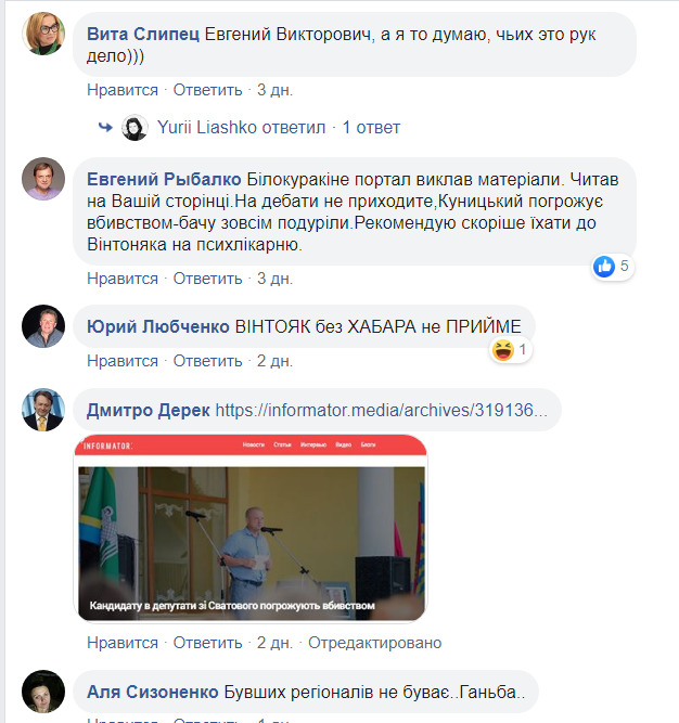 На що міський голова Сватового відповів: «Білокуракіне портал виклав матеріали. Читав на Вашій сторінці. На дебати не приходите, Куницький погрожує вбивством-бачу зовсім подуріли. Рекомендую скоріше їхати до Вінтоняка на психлікарню».