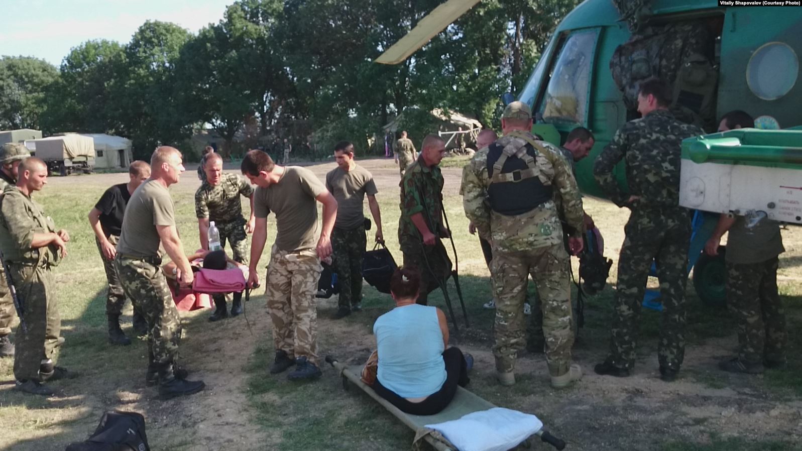 Раненые, в частности гражданская женщина, готовятся лететь с полевого госпиталя в стационарные медицинские учреждения. Лето 2014 года