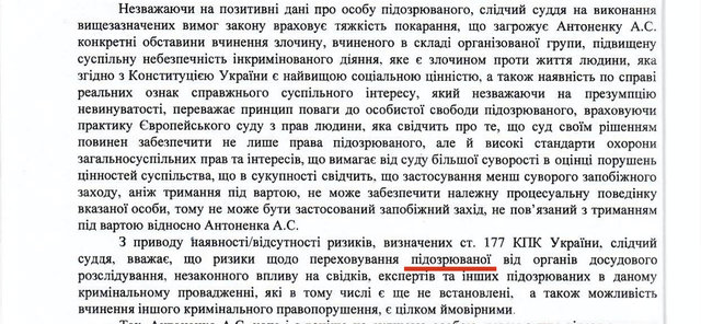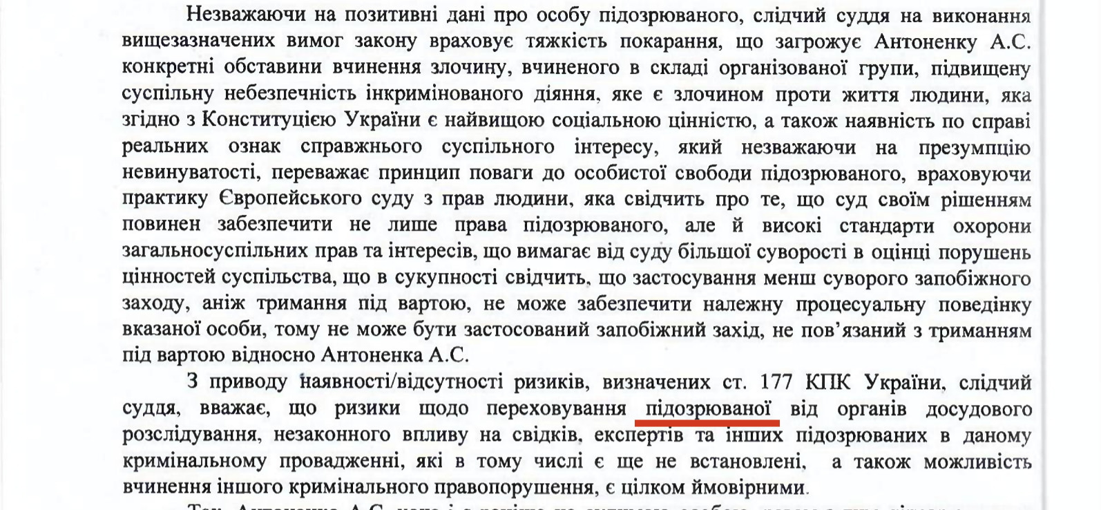 Вовк не виключення. Він за 5 днів писання ухвали сильно не заморочувався. Вдумайтесь в цей треш з боку слідчого — обґрунтовувати ризики знищення паном Антоненком доказів тим, що ці докази досі не знайшло слідство (!). Уявіть собі - раз ми за 3,5 роки не знайшли доказів, а підозрюваний, весь цей час, знаходячись на свободі, їх не знищив, то от прямо зараз він вийде з зали суду і це зробить. Організована група настільки законспірована, що ми нікого не знайшли, тому вона уся впливатиме на свідків, а якщо її ватажок буде в СІЗО - то ні, не впливатиме. Суддя все це божевілля підтримує, підтримує не коментуючи, просто погоджується.