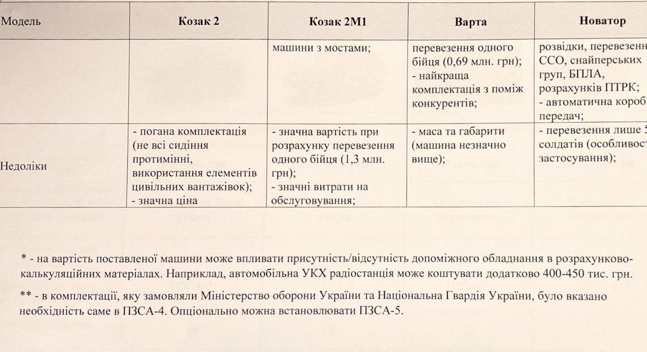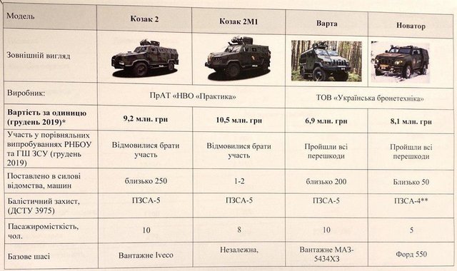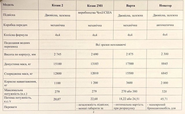 Аби уникнути власних трактувань та оціночних суджень, я пропоную вам подивитися на порівняльну табличку, в якій порівнюються бронемобілі "Козак 2", "Козак 2М1", "Варта" і "Новатор".