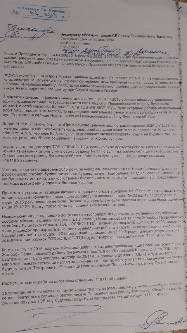 11 червня 2019 року я звернувся до в.о. голови СБУ Баканова із заявою щодо вчинення кримінальних правопорушень посадовими особами військово-цивільної адміністрації селища Новотошківське та с. Жолобок Попаснянського району Луганської області. Примітно, що після цього, наприкінці липня, заступник керівника Луганської обласної ВЦА Юрій Клименко, який був на цій посаді 5 років, написав заяву про відставку.
