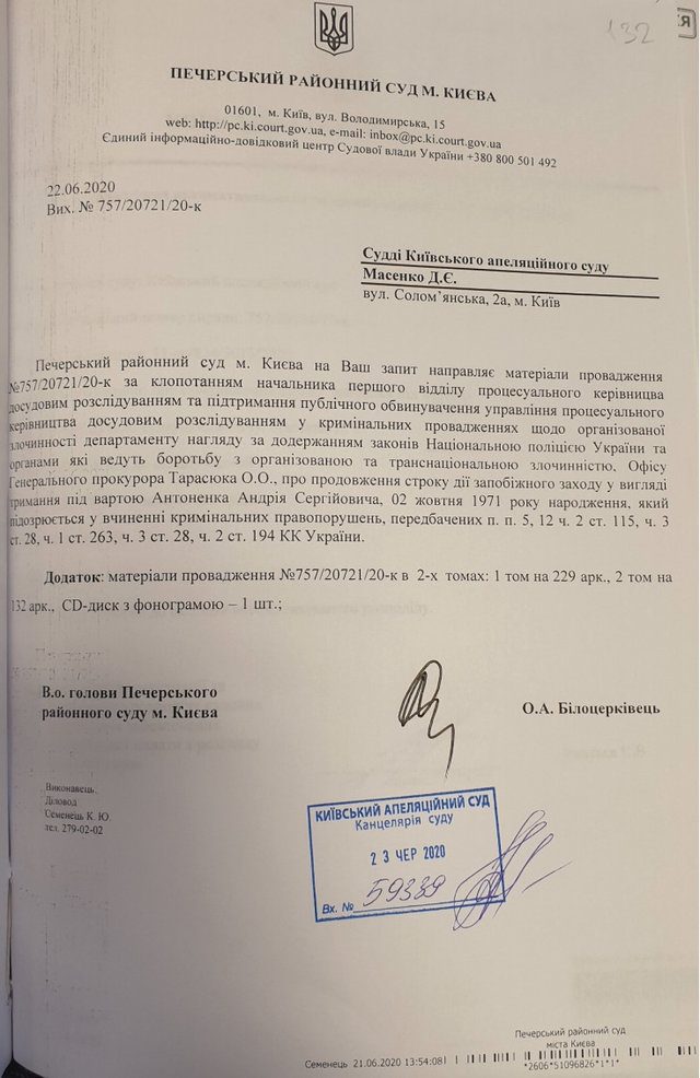 Нагадаємо, що відповідно до ч.2 ст. 422 КПК апеляційна скарга на ухвалу слідчого судді розглядається не пізніш як через три дні після її надходження до суду апеляційної інстанції. Апеляційна скарга надійшла 02.06.2020, але справа досі, вже на 38й день, не розглянута, оскільки Печерський суд не надсилав матеріали провадження аж до 22.06.2020.