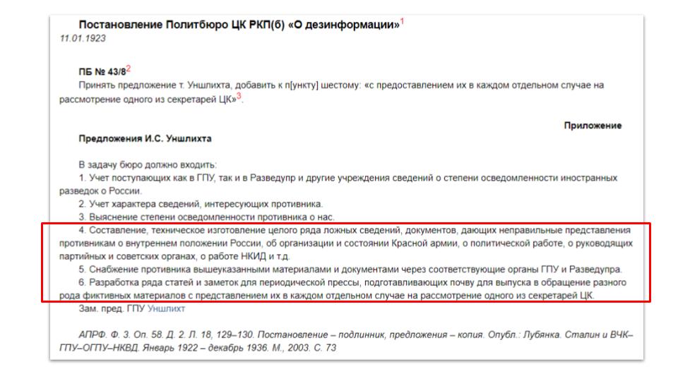 - Постановление Политбюро ЦК РКП(б) «О дезинформации» // https://www.alexanderyakovlev.org/almanah/inside/almanah-doc/1000408