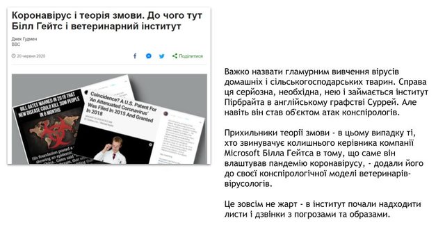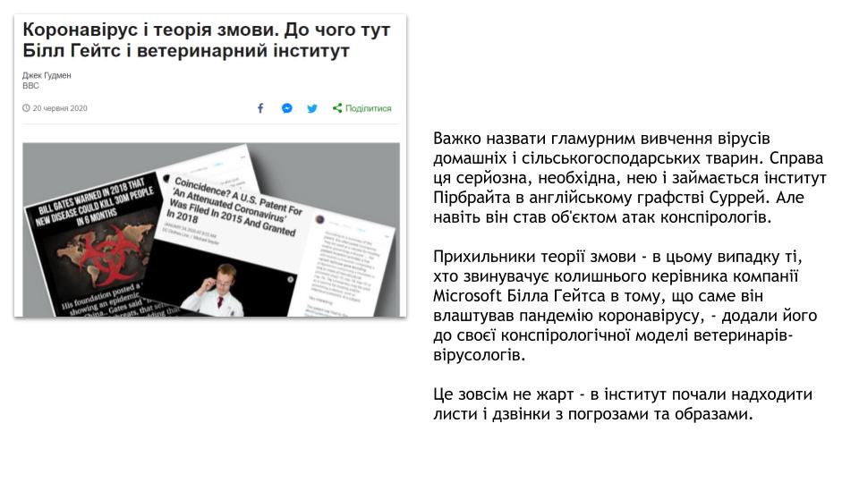 - Коронавірус і теорія змови. До чого тут Білл Гейтс і ветеринарний інститут // https://www.bbc.com/ukrainian/features-53119511