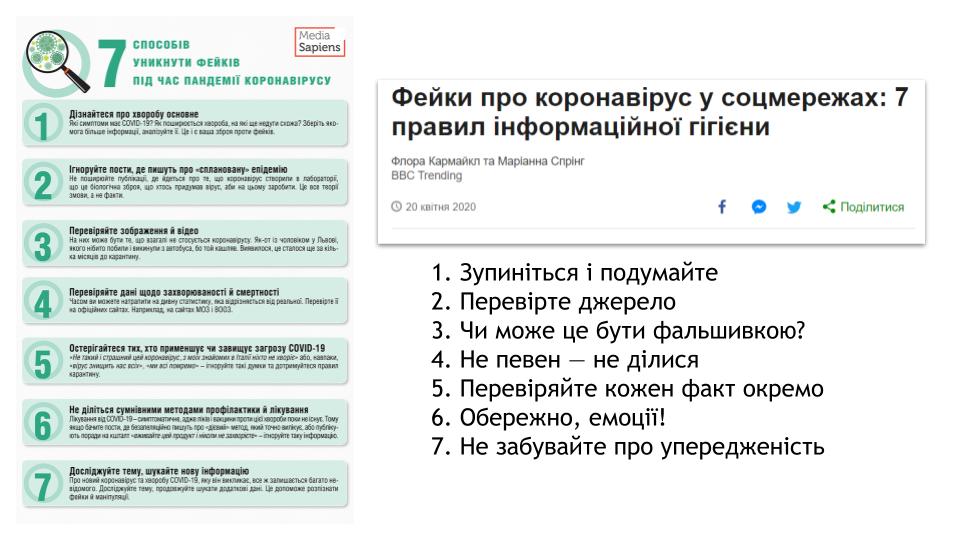 - 7 способів уникнути фейків під час пандемії коронавірусу // https://ms.detector.media/manipulyatsii/post/24393/2020-03-26-7-sposobiv-uniknuti-feikiv-pid-chas-pandemii-koronavirusu/