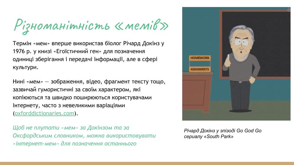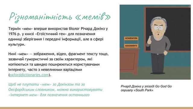 - Меми — різновид сучасного фольклору, який специфічно відображає актуальні для суспільства теми (інфопростір).
