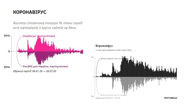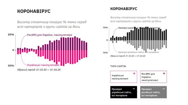 - Дезінформатори за допомогою нового тренду (пандемії коронавірусу) відпрацьовують старі. Наприклад, характеризують неспроможність України як держави через «невдалі» кроки у боротьбі з поширенням COVID-19.