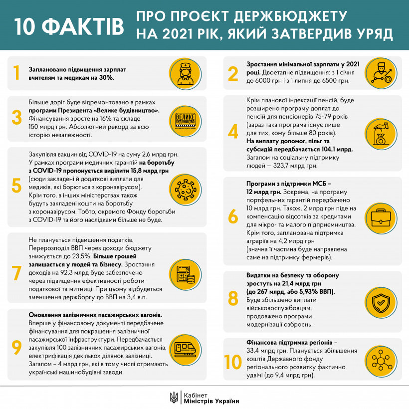 У проекті держбюджету-2021 закладено виділення 150 млрд на великі інфраструктурні проекти, зокрема на дорожнє будівництво, що допоможе створити нові робочі місця та частково відновити економіку.