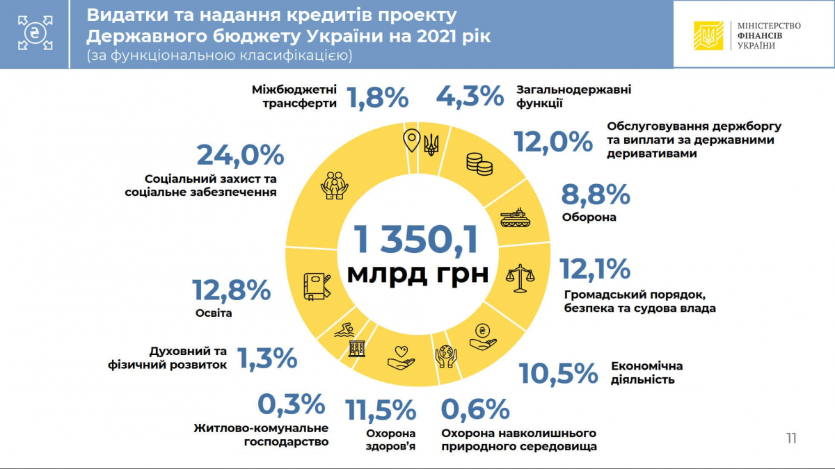 Усього 24,4% виділено на соціальних захист та забезпечення, 12,8 - освіта, 11,5 - на охорону здоров’я, 12, 1% - громадський порядок, безпеку та судову владу, 10,5 - економічна діяльність, 9,5% - оборона.