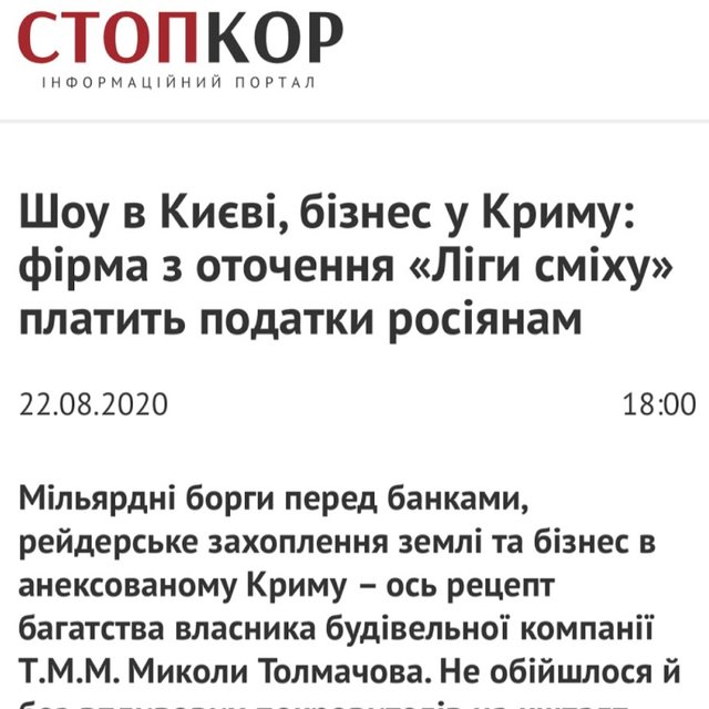 Ще один фігурант "розслідувань "Стопкору" - власник будівельної компанії "Т.М.М." Микола Толмачов. Його звинуватили у бізнесі з Росією та виведенні грошей в офшори. На думку бізнесмена, замовником подібних матеріалів міг виступити "Альфабанк".