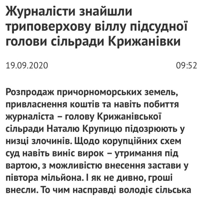 Наталя Крупица, сільський голова села Крижанівка (Одеська область), яка є постійним героєм публікацій “Стоп корупції”, пов'язує сюжети організації з місцевими виборами. За словами Крупиці, активісти ніколи не зв'язувалися і навіть не намагалися отримати її коментар.