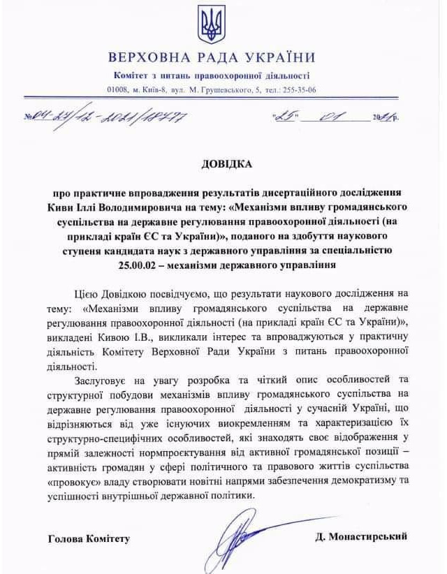 Але найгірше - нагорі держапарату. З огляду на те, що Кива - парламентар і дослідник у сфері держуправління, то й довідку про практичне впровадження результатів своєї наукової роботи (на фото) він отримував в парламенті.