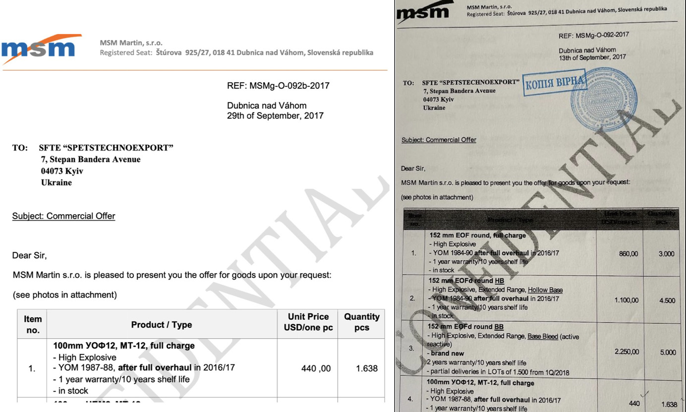 У вересні 2017 років, MSM MARTIN S.R.O надіслало декілька пропозицій ДП ДГЗП "Спецтехноекспорт" щодо постачання МОУ 100 мм Пострілів за імпортом, які пройшли ремонт в 2016-2017 рр. по ціні орієнтовно - 440 доларів США за одиницю.