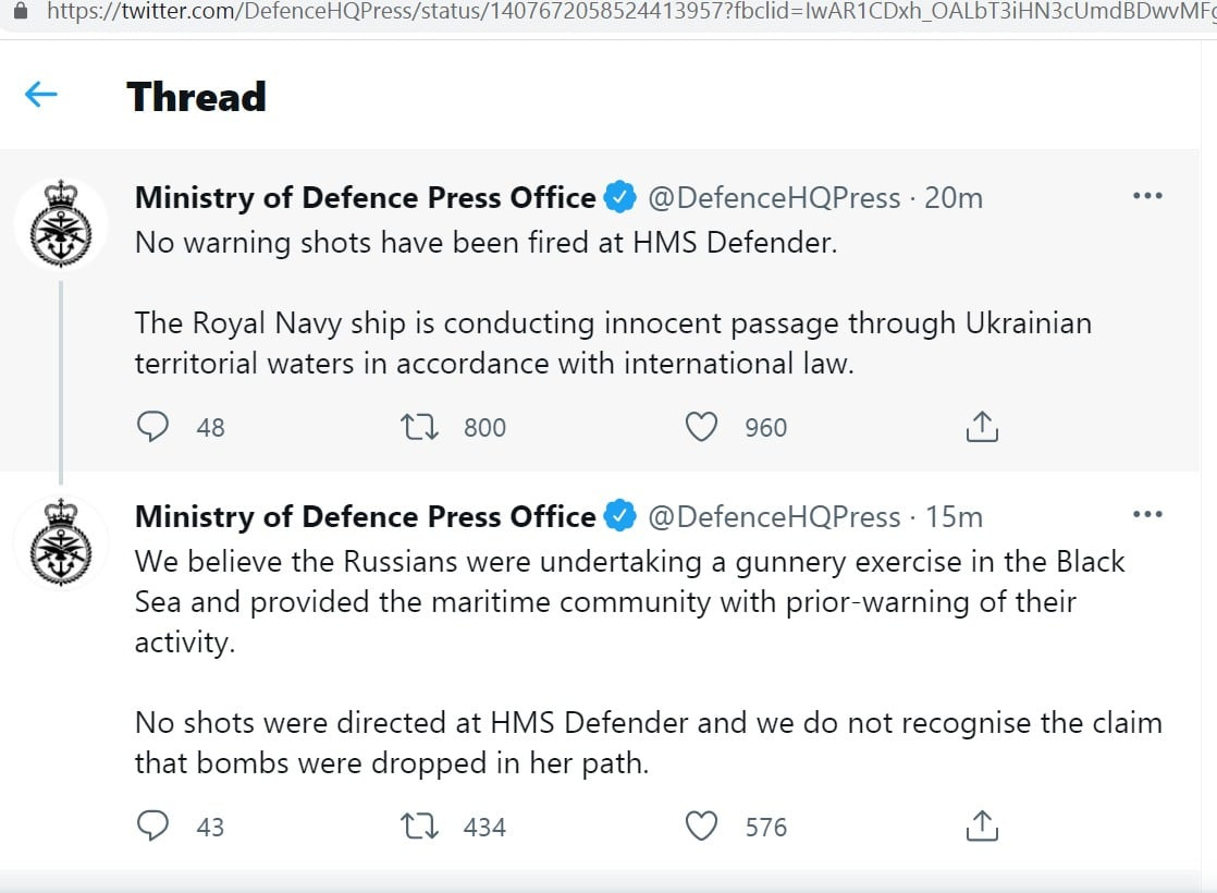 Це виглядало знущанням з росіян в дусі британського гумору. Втім, журналісти, які ЧОМУСЬ опинилися на борту "Дефендера", пізніше підтвердили: хоча агресивні дії з боку російських сторожовиків та авіації дійсно мали місце, з самого корабля не можна було зрозуміти, що росіяни вели саме попереджувальний вогонь; а попереджувального бомбардування взагалі не було.
