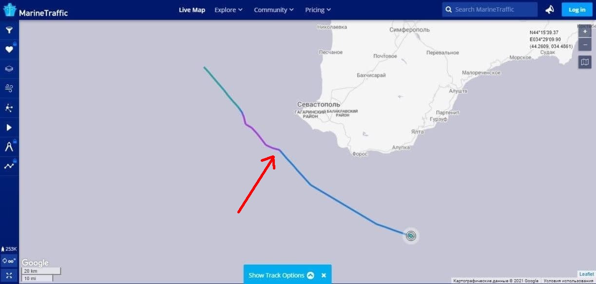 Надвечір з'явився і трек – маршрут есмінця, з позначенням того відрізку, де корабель "порушив російський кордон" і супроводжувався російською бойовою технікою. З треку цілком очевидно, що прямо до берегів Криму "Дефендер" не йшов, відповідно, нікуди від них і не розвертався; просто пройшов повз і рушив далі, до місця призначення (це був грузинський Батумі).