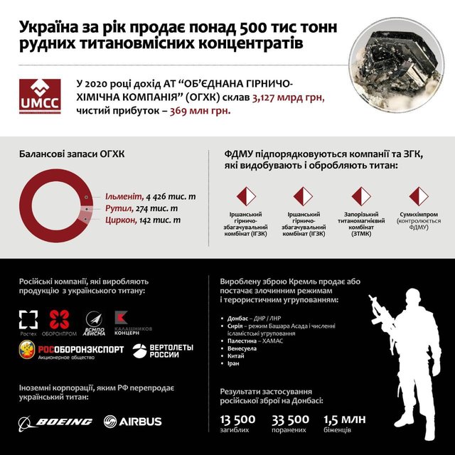 Український титан насамперед постачається світовому лідеру ВСМПО-АВІСМА, яка входить до корпорації "Ростех". Та, в свою чергу, об’єднує оборонні підприємства: Рособоронекспорт, концерн "Калашніков" та "Веролеты России".