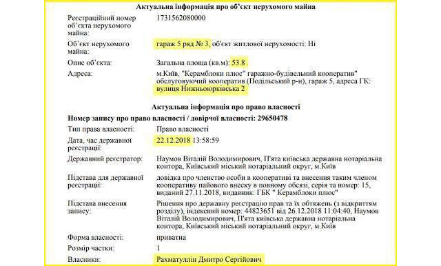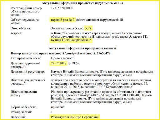 Також серед його майна значиться квартира в Маріуполі за 180 тисяч доларів, земельну ділянку в Київській області за 40 тисяч доларів, автомобіль GMC Acadia 2016 року випуску за 25 тис. доларів і 50-метровий (розміром з "двушку"!) гараж на Подолі за 20 тис.