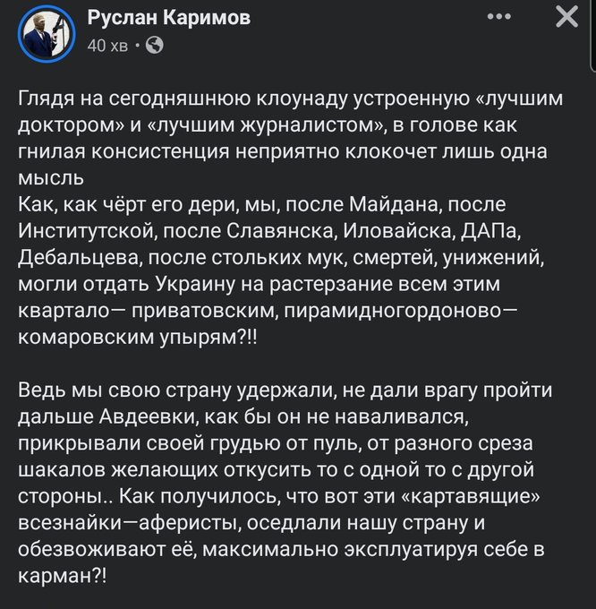 Предела наглости и цинизму нет. 13 февраля 2020-го года межведомственная комиссия Министерства по делам ветеранов Украины предоставила статус участника боевых действий начальнику комитета по разведке при президенте-первому секретарю СНБО Руслану Демченко. Это официальный ответ Минветеранов на запрос Микола Мельник.