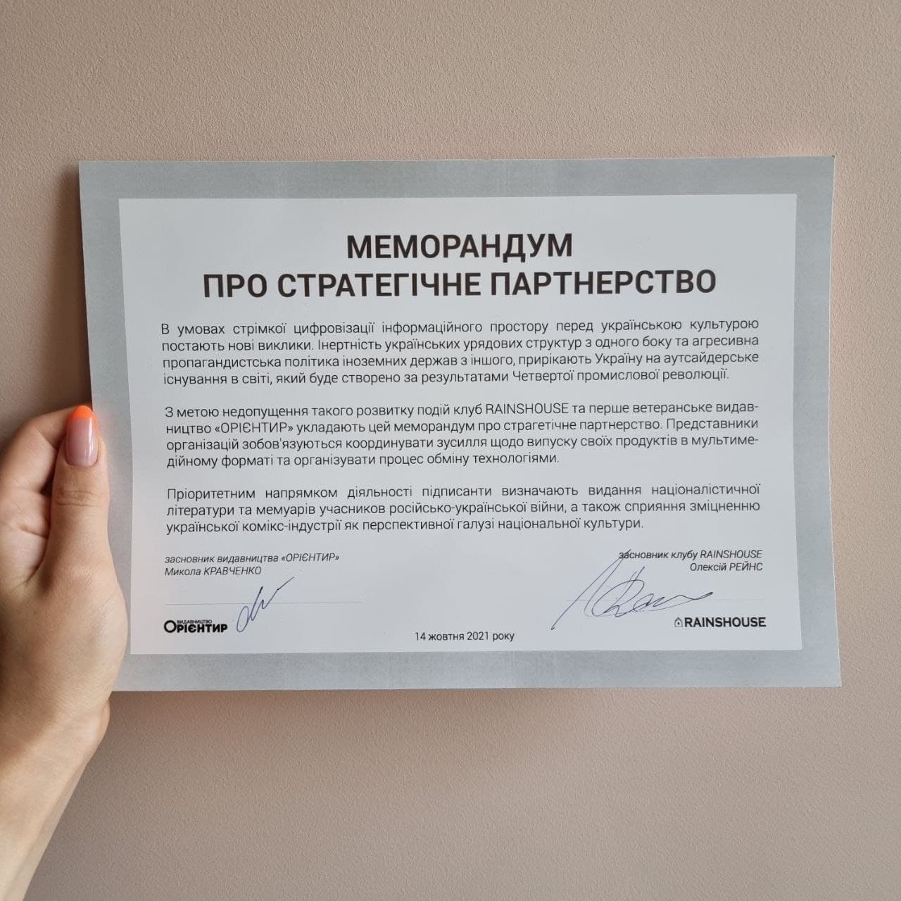 Позитивний досвід співпраці між видавництвом «ОРІЄНТИР» та клубом RAINSHOUSE можна побачити в заходах до Дня Українського коміксу в лютому-2021. Після вчорашнього укладання меморандуму ця співпраця стає стратегічною. Тепер очікуйте орієнтирівських книг в електронному форматі та змістовно українських коміксів.