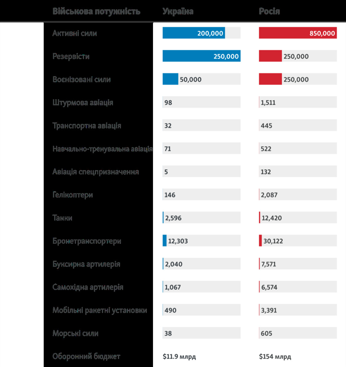 Пропоную розглянути інфографіку, яку мали потужність Збройні сили України проти росії на лютий 2022 року.