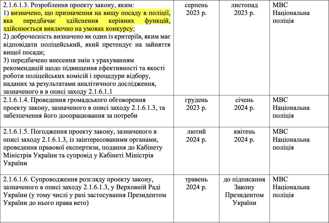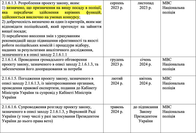 Тут чорним по білому: повинен бути розроблений законопроєкт, яким визначено, що призначення на вищу посаду в поліції, яка передбачає здійснення керівних функцій, здійснюється виключно на умовах конкурсу.