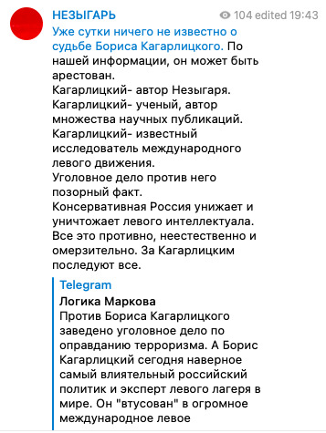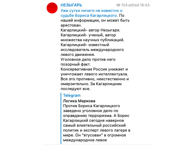 В защиту Кагарлицкого стала даже матрона роспропаганы Симоньян на тг-канале “Незыгарь”: “Кагарлицкий - ученый, автор множества научных публикаций. Кагарлицкий- известный исследователь международного левого движения. Уголовное дело против него позорный факт.