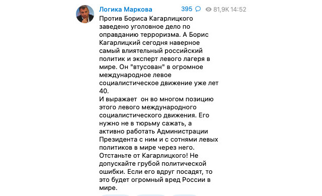 Собственно мои слова подтверждает записной пропагандист Кремля Сергей Марков: ”Кагарлицкий сегодня наверное самый влиятельный российский политик и эксперт левого лагеря в мире. Он "втусован" в огромное международное левое социалистическое движение уже лет 40. И выражает он во многом позицию этого левого международного социалистического движения. Его нужно не в тюрьму сажать, а активно работать Администрации Президента с ним и с сотнями левых политиков в мире через него”.