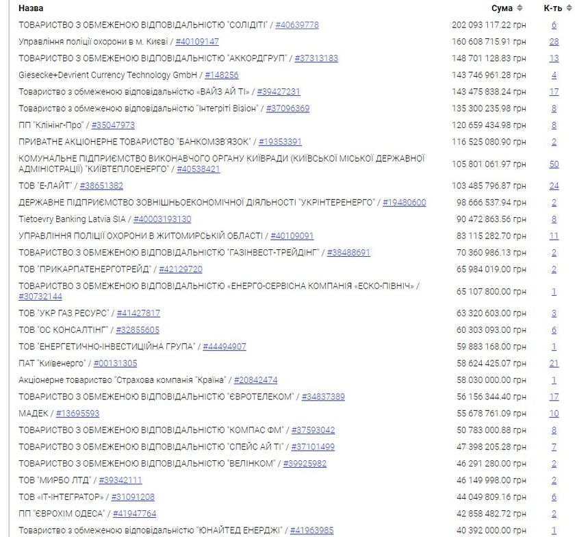 На фото топ-30 постачальників НБУ, які проходили через публічні тендери, є дуже цікаві компанії