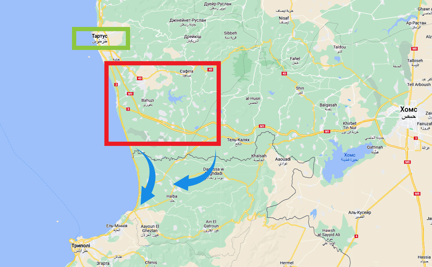 На опублікованій мапі червоним виділено район, де розташоване виробництво. Зеленим обведено населений пункт Тартус, через який налагодено поставки до рф. Синім — дві дороги на Тріполі та Бейрут. Ця територія контролюється Хезболлою, вони працюють з усіма і з Росією в тому числі. Усі справи з виробництва зокрема дронів обговорюються між росіянами, представниками Хезболли та залученими у бізнес місцевими сирійськими військовими у ресторані південного передмістя Тартуса.