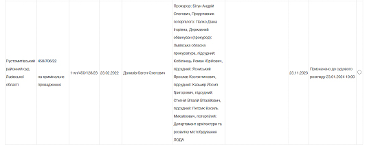 Просто її тихо розглядає (точніше зовсім не розглядає, враховуючи що за останні 2 роки відбулось аж одне засідання) Пустомитівський районний суд Львівської області (справа № 450/706/22, провадження № 1-кп/450/128/23).