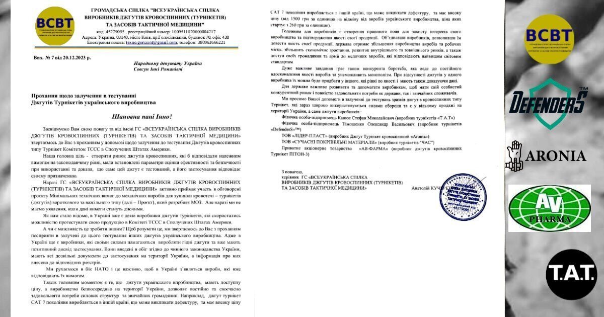 Щодо розвитку виробництва і ринку турнікетів. Відкритий лист народному депутату України Совсун Інні Романівні