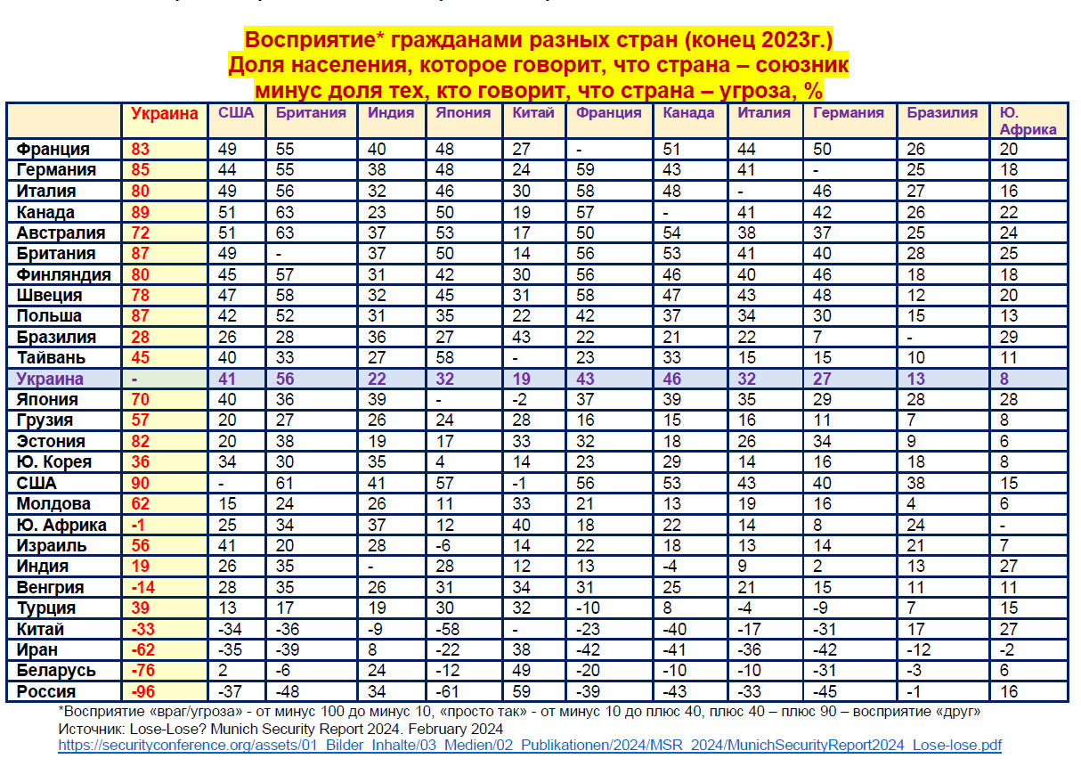 В конце 2023г. круг друзей, партнёров Украины, по мнению украинцев, входили Франция, Германия, Италия Канада, Австралия, Британия, скандинавские страны, страны Балтии, Польша, Япония и США. А вот к украинцам такого однозначного, восторженного отношения со стороны партнёров нет. Так США относится к Украине, как с союзникам/партнёрам с показателем +41%. У нас к Америке +90%. Среди стран G7 больше всего Украине симпатизируют британцы - +56%. У нас к Британии - +87%. Для японцев мы в нейтральной/серой зоне +32%, для нас японцы - +70%. Французы к нас на +43% (союзники), мы к французам – на +83%. Немцы к нам только на +27%, мы к немцам – на +85%. Канадцы к нам на +46%, мы к канадцам – на +89%.