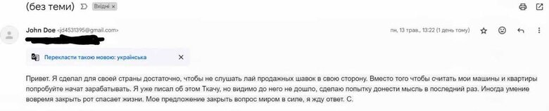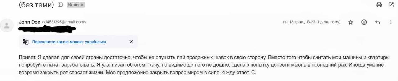 І ось впродовж останніх днів на адресу Михайла Ткача надходять погрози від того самого Слобоженка. Цей любитель Ferrari, Lamborghini та іншої олігархічної розкоші пропонує Ткачу «укласти мирову за грошову винагороду» і вимагає «не тягнути з відповіддю». А паралельно були спроби зламу акаунтів Ткача, в тому числі банківських. Врешті-решт якийсь персонаж, який представився як «С.», відправив Ткачу та його колегам-журналістам листи з відкритими погрозами, зокрема заявивши, що «іноді вміння вчасно закрити рота рятує життя».