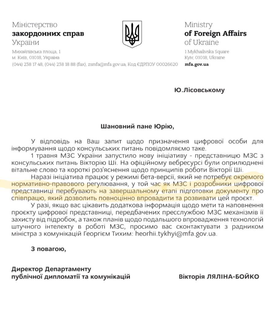 Через те, що користуватись ШІ зараз круто, є вже кілька органів влади, які публічно казали про те, що застосовують його у своїй роботі: НАЗК та Верховна Рада. Проте кожного разу, при вивченні питання детальніше у відповідь на інфозапит, вони насправді повідомляли, що лише ознайомлювались із роботою чи просто використовували модний термін. Цього разу ШІ вирішили застосувати й у МЗС, щоб допомагати отримувати консульські послуги за кордоном. Підхід цікавий, адже замість цілого кол-центру і багатьох людей в різних країнах може працювати компʼютер. Проте, на запит прийшла відповідь, що опублікований чат-бот "Вікторія ШІ" це лише ініціатива (тут питання до юристів, чим у нас регламентуються ініціативи?) МЗС і вони вже готують документи про співпрацю з розробниками бота.
